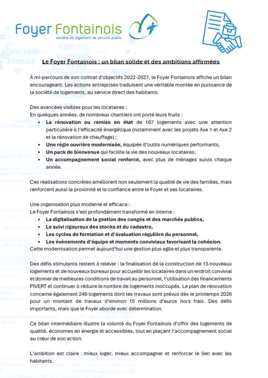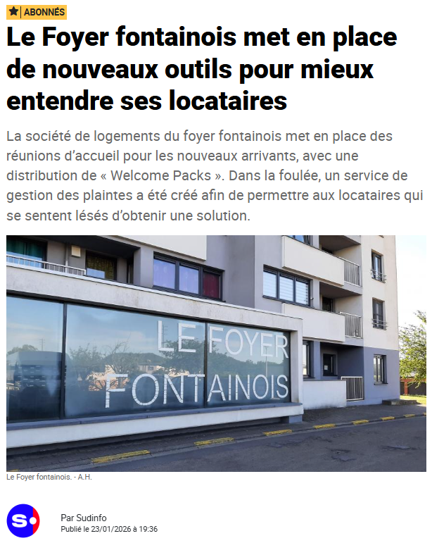À partir du 1er janvier 2026, le Foyer Fontainois adapte son organisation et ses horaires afin d’améliorer la qualité de l’accueil et de renforcer le suivi personnalisé proposé à chaque locataire. Permanences physiques (sur rendez-vous uniquement): Afin de garantir un accompagnement plus ciblé et de permettre un traitement plus efficace des dossiers, les permanences physiques seront supprimées et désormais nos services vous recevront uniquement sur rendez-vous le jeudi. Elles...