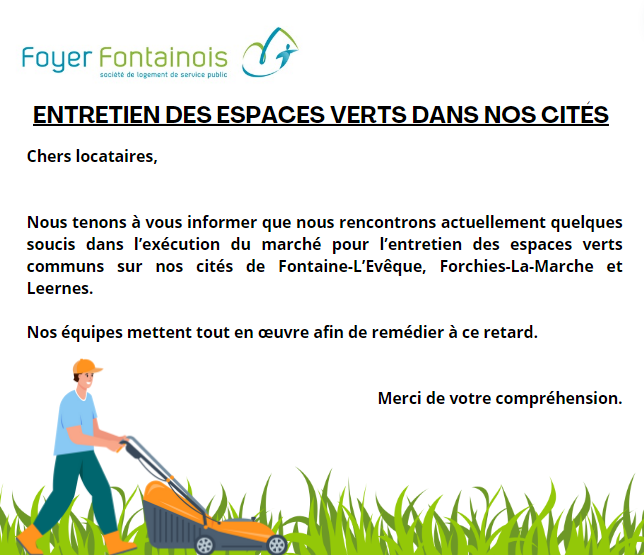 Chers locataires, Nous vous informons que la société Deneyer est actuellement en train de tondre les espaces verts de nos cités afin de pallier au retard engendré. L'entretien de l'ensemble des espaces verts de nos cités suit sont cours. Nous vous remercions pour votre compréhension.