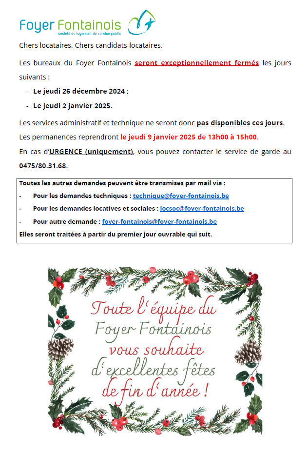 Chers locataires, Chers candidats-locataires, Les bureaux du Foyer Fontainois seront exceptionnellement fermés aux dates suivantes: Le jeudi 7 décembre 2023 à partir de 12h00; Le vendredi 8 décembre 2023; Le mardi 26 décembre 2023; Le mardi 2 janvier 2024; Les services administratifs et techniques ne seront donc pas disponibles. Attention : à partir de janvier 2024, les permanences sans rendez-vous auront lieu le jeudi après-midi uniquement (de 13h00 à 15h00). La première permanence de...