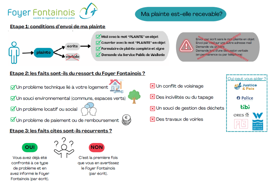 Le Foyer Fontainois a décidé de mettre en place un service de gestion des plaintes. Ce service sera effectif à partir du 1er septembre 2024. Depuis quelques années, nous avons constaté que nos différents services recevaient des plaintes par écrit, par téléphone ou même lors de visite à domicile, de la part des locataires concernant des sujets divers (conflits de voisinage, problèmes techniques, etc). Nos services tentent d’apporter une solution au quotidien pour chaque situation...